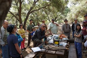 We will create coals in our fire, which you will then carefully put onto your wood. You let it burn a bit, and then you scrape. You create a little hole, and then you add another coal, and repeat, and repeat. Bring a spoon for scraping. Bring eye protection too.