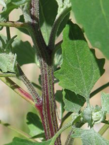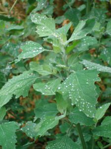Lamb’s quarter is easily recognized by its roughly toothed leaves that are somewhat triangular in shape. The leaves are covered with a fine white mealiness which causes water to bead up on the leaf surface. The older stems often have red stripes and red in the axils.