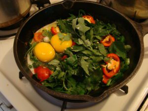 Oil a cast iron skillet, and heat it. Add the lamb’s quarters and onion and cook for about two minutes. Add the eggs and cook til done. Serves two