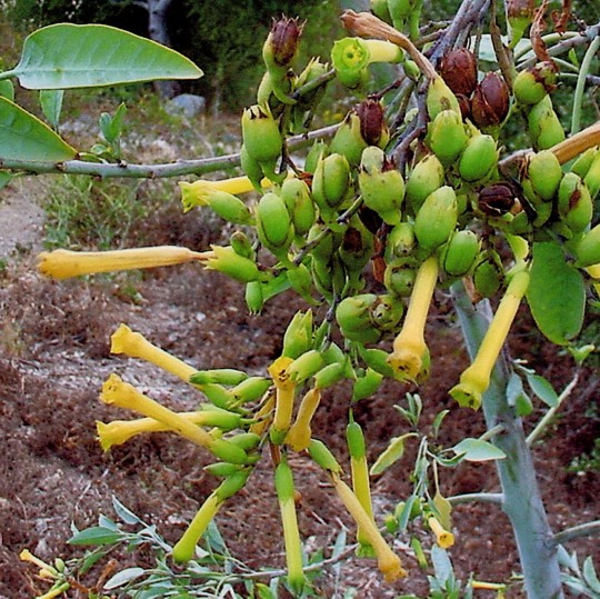 But not all members of the nightshade family are good to eat.  Some members of this plant family can kill  or intoxicate.  All  tobaccos, wild  and cultivated, are nightshades.  One Brazilian tobacco which is common in the west and south, known as tree tobacco (Nicotiana glauca), resembles pokeweed when it is young.  Pokeweed, incidentally, is also a poisonous plant as it matures, and everyone who eats the young pokeweed shoots knows that you boil it, change the water, and boil it again.  People who’ve resided in Mexico or the Southern U.S. have encountered tree tobacco, assumed it was poke, and processed it like poke and eaten it.  While poke’s toxins are water-soluble, tree tobacco’s are not, and such a dish can kill.