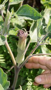 I rubbed the leaves between my fingers and smelled the strange odor.   It reminded me of rancid peanut butter.  The specimen that Joe showed  me had  a few dead branches from the previous season’s growth.  It still contained some of the thorny seed pods, which gives rise to another of its common names, thornapple.  There are several species of Datura known as Jimsonweed.  The common east coast variety grows a bit taller and is very common along roadsides.  In the west, the low-growing Datura is found in dry waste areas.