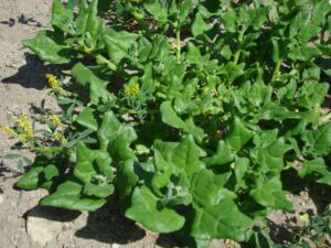 New Zealand leaves are alternately arranged on the stems. The leaves are fleshy and succulent and in their general outline, they resemble common spinach or lamb’s quarter, though the plant is weak stemmed and sprawls in the sand, rarely rising more than a few inches off the ground. The individual leaves are rarely more than 2 inches long.