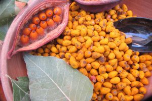 Where I grew up in Pasadena, our street was lined with stately and aromatic camphor trees, with their oval-shaped leaves that perfumed the air with camphor when you crushed them. The fruits were little globose fleshy fruits about a quarter inch in diameter, with one seed inside. There was one tree, however, whose leaves looked like the camphor, but the fruit did not. It had a hard little pod that looked like a miniature wooden canoe. Inside the pod were about a dozen orange seeds. I’d assumed it was a type of a camphor, or just one of those ornamentals from somewhere else with no practical uses at all.