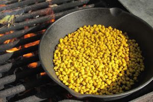So I took my cleaned seeds, bright yellow, and placed them in a cast iron skillet over the fire and roasted them. I didn’t use oil, but just shook the skillet from time to time over an approximately 15 minute period. I heard some seeds pop, but mostly they just faded from a bright yellow to a dull yellow bordering on brown. I did this during an outdoor class I was conducting, and I let 8 students taste the roasted seeds. Everyone thought the seeds had been good raw, but they were very much improved when they were roasted, again tasting even more like corn. At least two thought that the flavor of the seeds was more like sunflower seeds.
